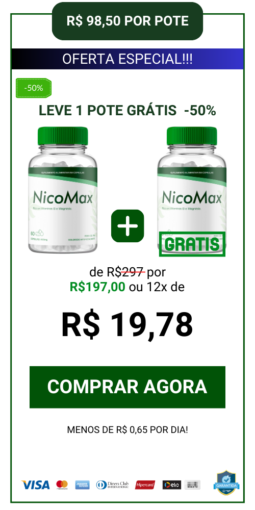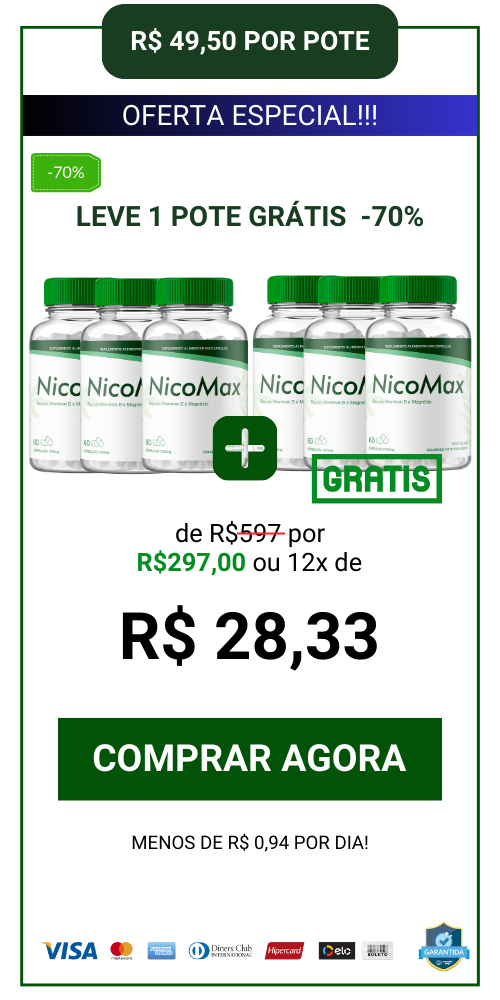 O NicoMax é protegido pela Garantia Blindada, se onde dentro de 90 dias você achar que o suplemento não fez o efeito desejado ou não apresentou nenhuma melhora em seu caso, basta entrar em contato com nossa equipe que iremos lhe devolver 100% do valor investido na hora!